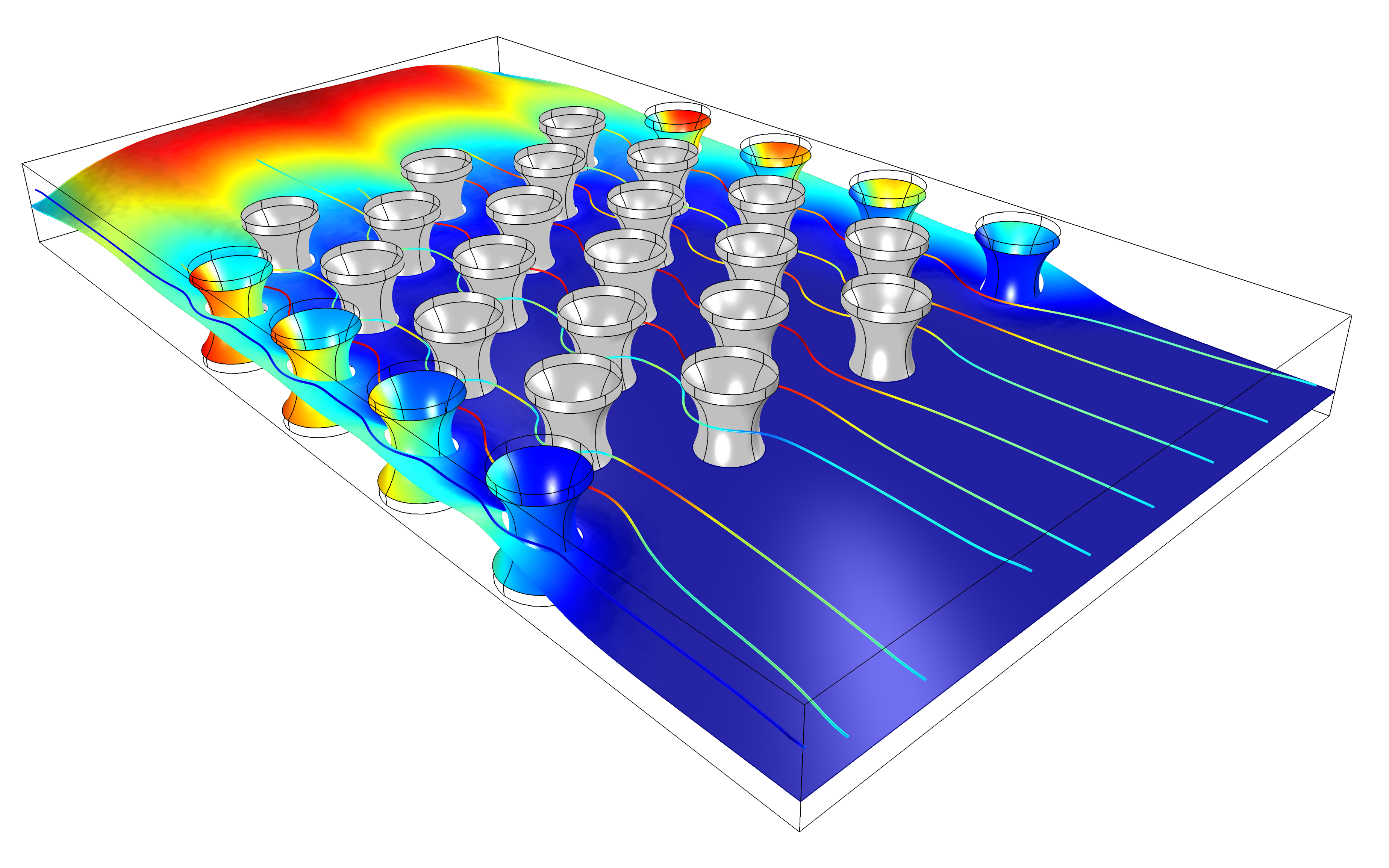 Biocapteur : Simulation d'une cellule d'écoulement contenant des micropiliers recouverts d'un matériau actif pour favoriser l'adsorption d'une espèce d'analyte. Le résultat montre les lignes de vitesse et la distribution de la concentration de l'espèce adsorbée.