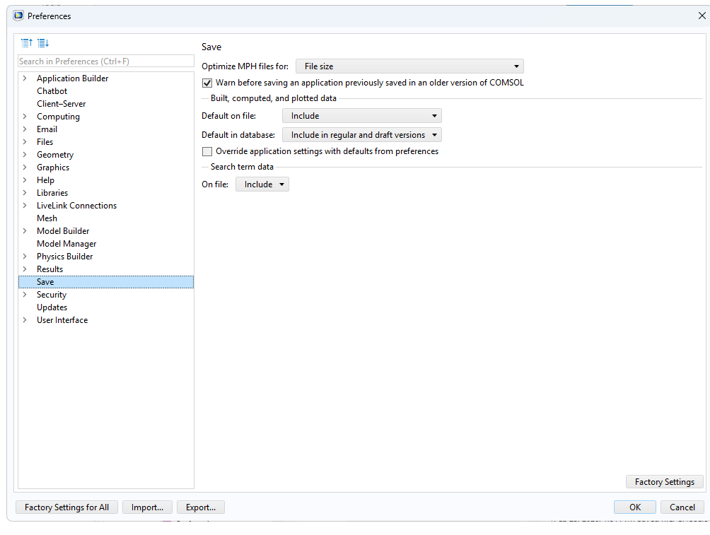 A COMSOL Multiphysics® simulation typically includes one or more field quantities in its output. Depending on the number of field quantities, the geometry’s complexity, and the mesh density required for valid results, simulations can include millions of degrees of freedom (DOFs). Oftentimes, storing one or more scalar quantities or the results on a small geometry part is sufficient. Here, we explore tools for storing selected output quantities and minimizing model file sizes and the time required to display this data. Also, a preference setting is available for storing model files in a more compact way.