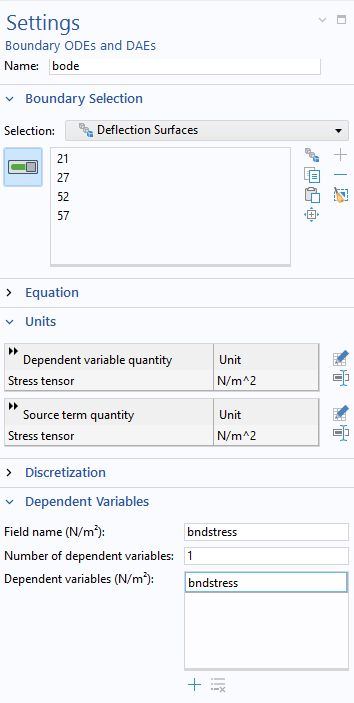 In the Settings window for the main Boundary ODEs and DAEs interface, use the same Deflection Boundaries selection for the top surfaces. Make sure to specify the units so that they are compatible with a stress quantity. You can do so by choosing Stress tensor as the quantity for the new dependent variable and for the source, which is the von Mises stress from the main Solid Mechanics interface.