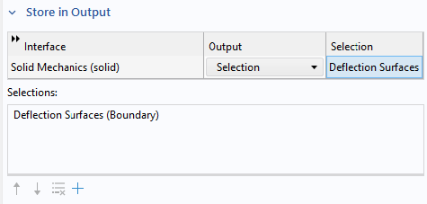 You can now modify what to store in the output. In the Settings window of the Study step node, locate and expand the Store in Output section. This section contains settings for storing parts of the solution as output. First choose Selection from the drop-down menu in the Output column. You can then click the Add button under Selections to open a list with available selections. In this case, choose the Deflection Surfaces (Boundary) selection and click OK. To completely exclude dependent variables from storing them in a model, choose None from the drop-down menus in the Output column.