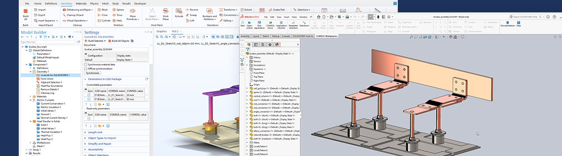 You can use the LiveLink interface bidirectionally, but synchronization is always initiated from COMSOL Multiphysics. The interface uses an associative transfer of your geometry from the CAD program to the COMSOL model that ensures that all of your geometry settings are retained. You can also modify the geometry in the CAD program by sending the name and value of a dimension or parameter to the CAD software. There, the geometry is updated and rebuilt and then finally transferred back to COMSOL Multiphysics.
