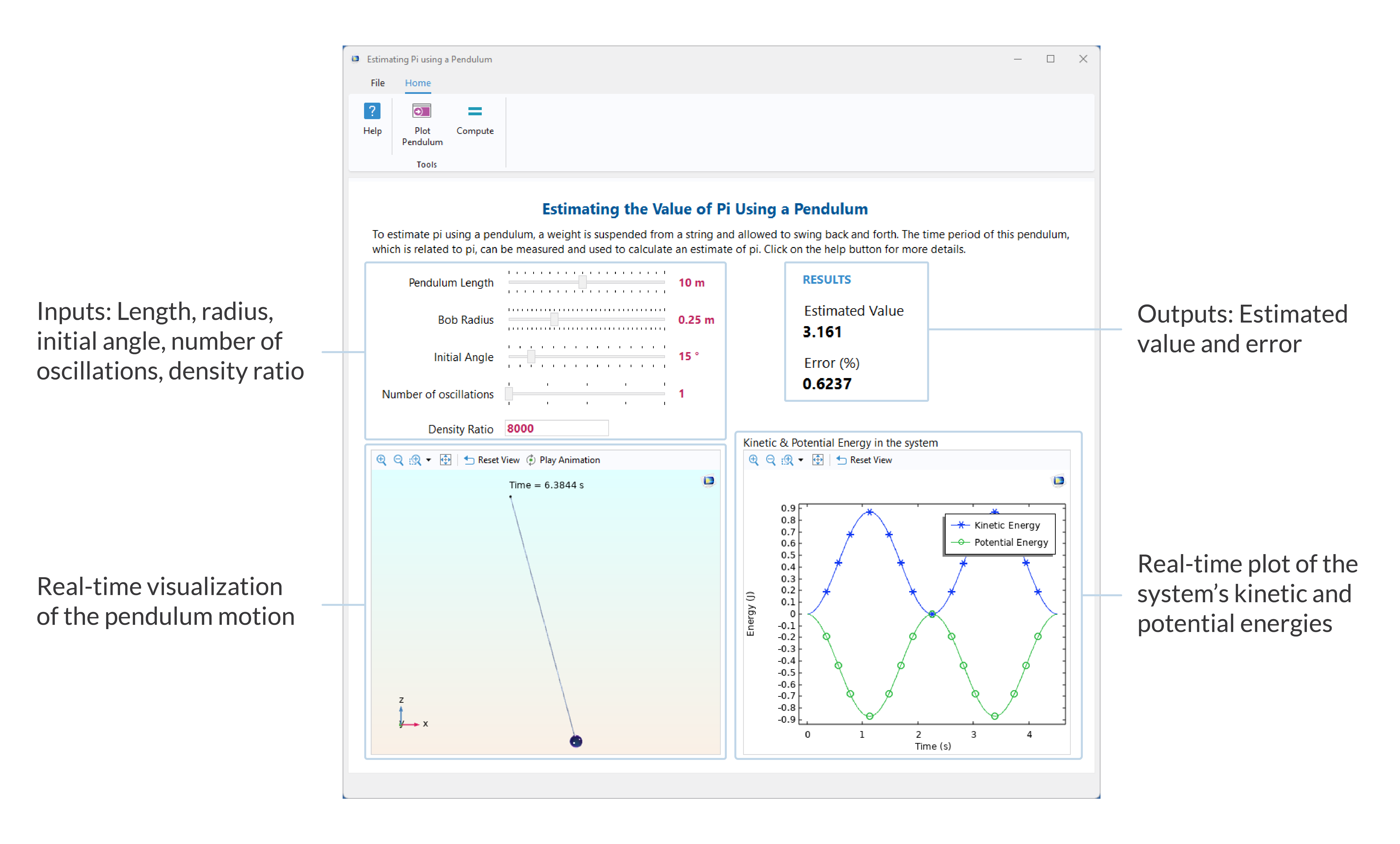 Once you have chosen the desired parameters for your pendulum, clicking the Plot Pendulum button displays what your pendulum looks like based on the chosen values. The Compute button can then be used to simulate the pendulum, during which the Graphics window and the energy plot are updated in real time. After the solve, the estimated value of pi and the error from the true value are displayed to reflect the results obtained from the current solve. Feel free to share the set of input values that gave you the best estimate of pi in the comment section below!