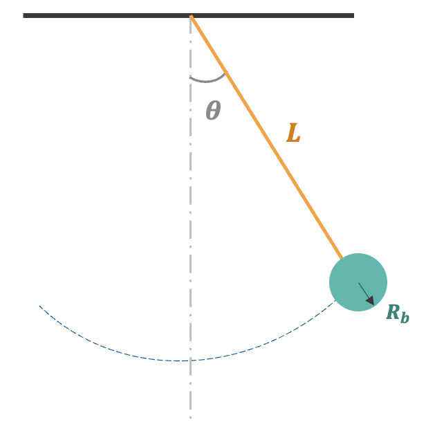 A pendulum comprising a string of length L and a bob of radius Rb being released at an initial angle θ.