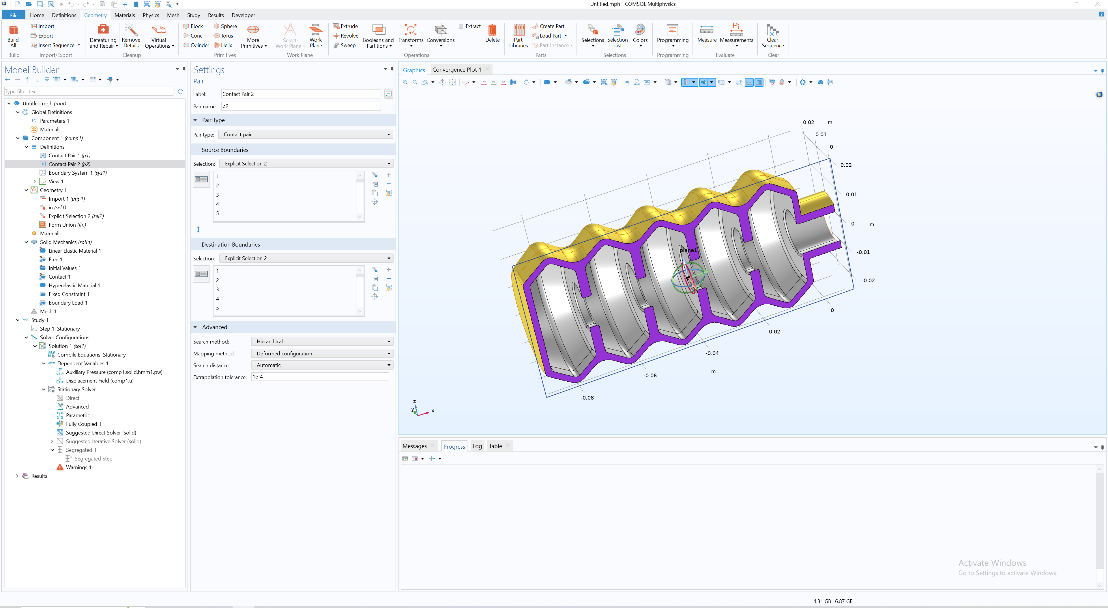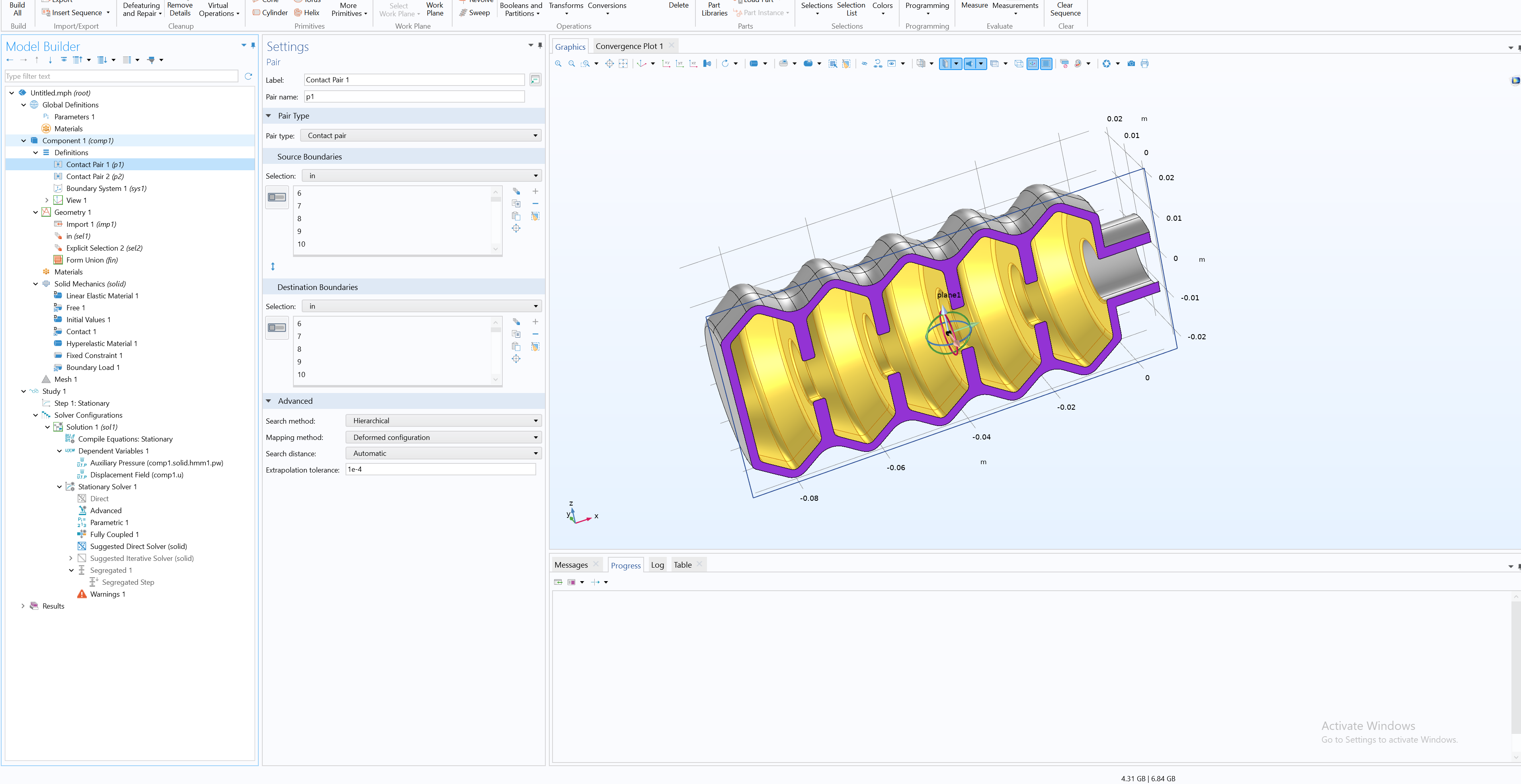 I am simulating a soft robotic linear actuator in COMSOL Multiphysics. The actuator is compression based so I apply a negative pressure on the internal surfaces. I need to set up the simulation in such a way that it recognizses when the part comes in contact with itself. For this I have provided contacts. But when I provide contacts the solution does not converge at all. I am using a hyperelastic material model for modelling. I have also tried to use Nitsche contact method for self contacting but the same issue persists. Can anyone please help me with it! Thanks!!!