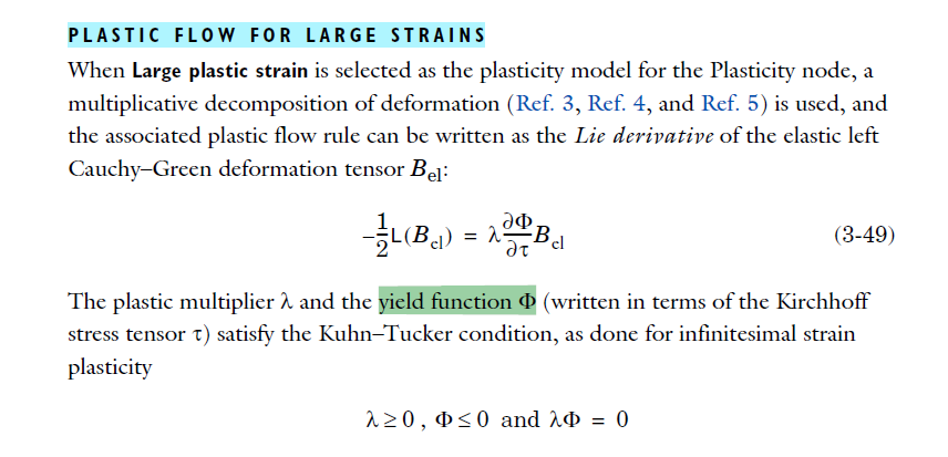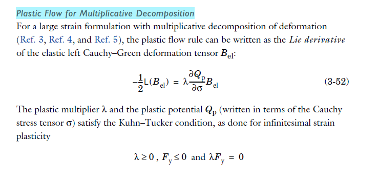 Dear Jeff, Thank you for your message. I however did some hand calculations and I think the 6.0 documentation was correct (in multiplicative plasticity, the flow rule is written in terms of Kirchhoff stress). I can derive the equation written in COMSOL's equations page from that, please see the bracketed term in the attached screenshot image(4). If I use the equation from 6.2, I do not obtain the Jacobian J, in the beginning of the equation. Could you please elaborate or point me towards the correct reference it was taken from? Thank you, Ratul