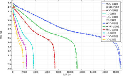 本模型应用COMSOL中锂离子电池模块、固体传热模块,建立三维电化学-热耦合模型。根据软包三电极实测数据分别标定常温不同倍率充放电条件全电池电压、正参电压、负参电压,确定电化学动力学参数与热力学参数,完成模型的标定,然后将得出的电化学动力学参数与热力学参数运用到方型电芯的模型中,能够实现对方型电芯的常温倍率性能的预测。