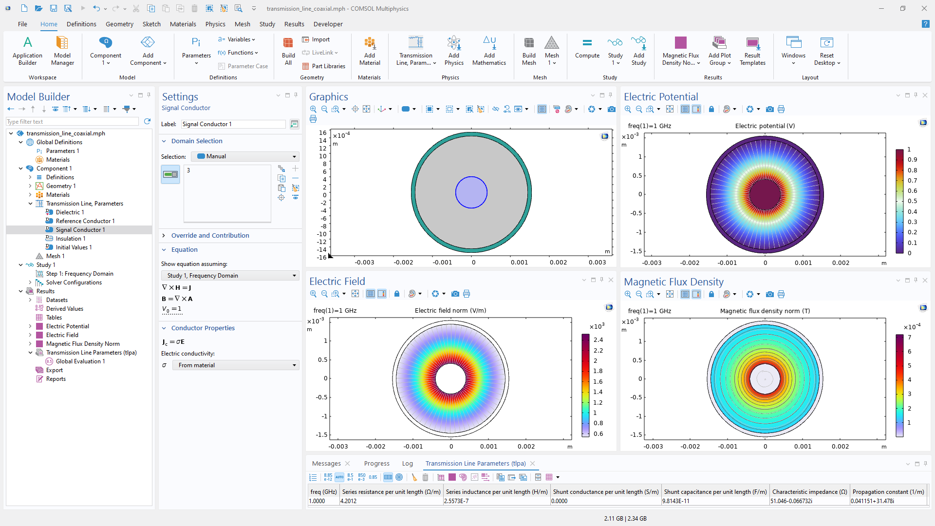 The electric potential, electric field, and magnetic flux density of a coaxial cable.