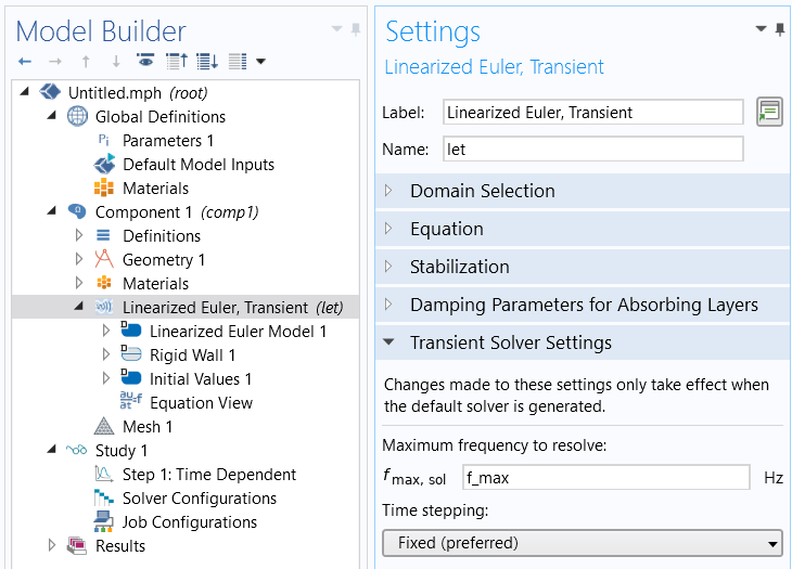For an example of these mesh and solver settings, see the Transient Gaussian Explosion model in the Application Library of the Acoustics Module.