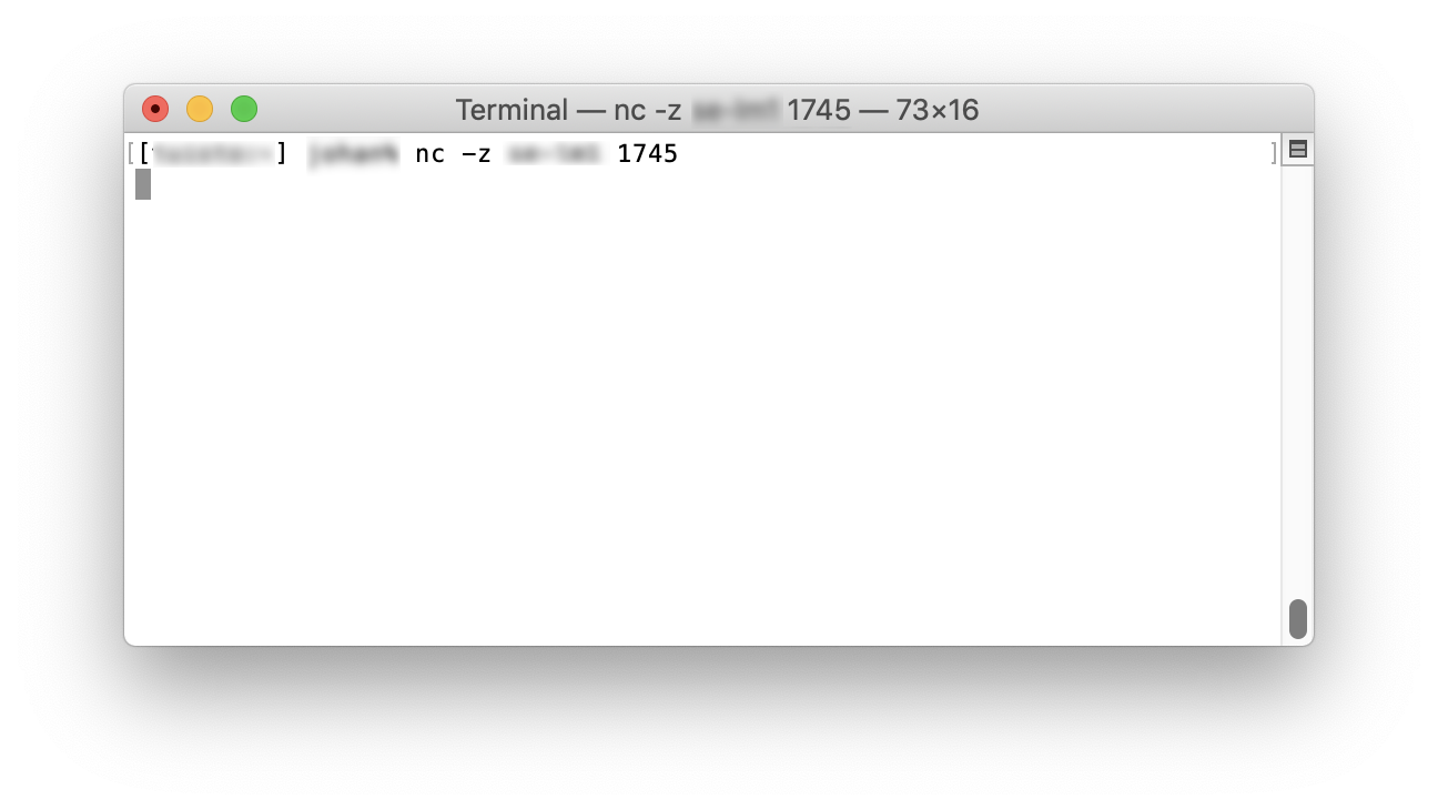 From a terminal, run the command nc -z hostname portnumber where hostname should be replaced with the hostname of the license server machine, and portnumber should be replaced with the port you want to test to connect to. The default ports used are 1718 and 1719.