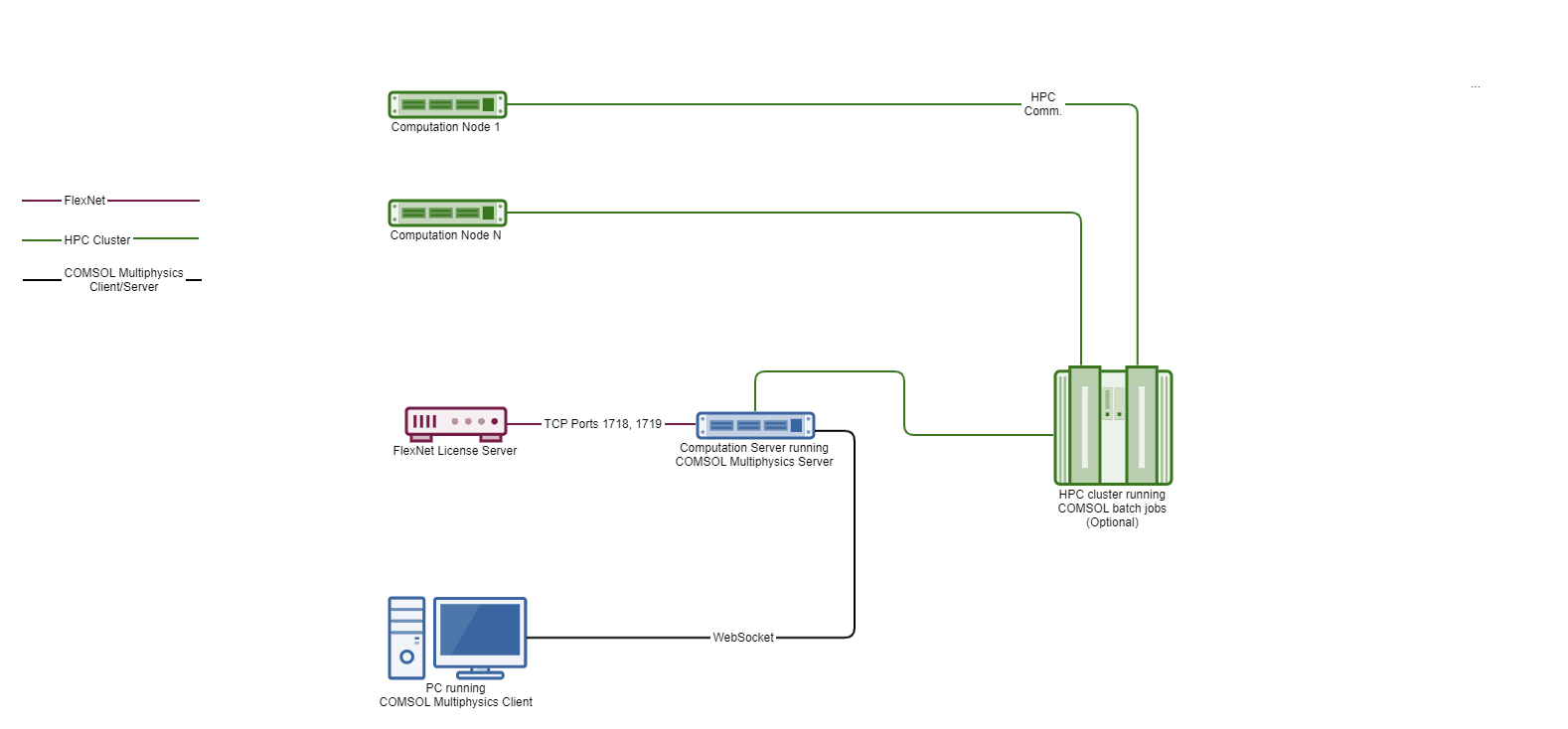 The diagram below illustrates the client–server TCP connection between different computers and TCP connections to the default ports 1718 and 1719 for the license server. (A license server is required for the FNL license.) The diagram also illustrates that the COMSOL Multiphysics server can submit batch jobs to a HPC cluster. Typically, a separate network is used for the communication between the compute nodes and the head node.