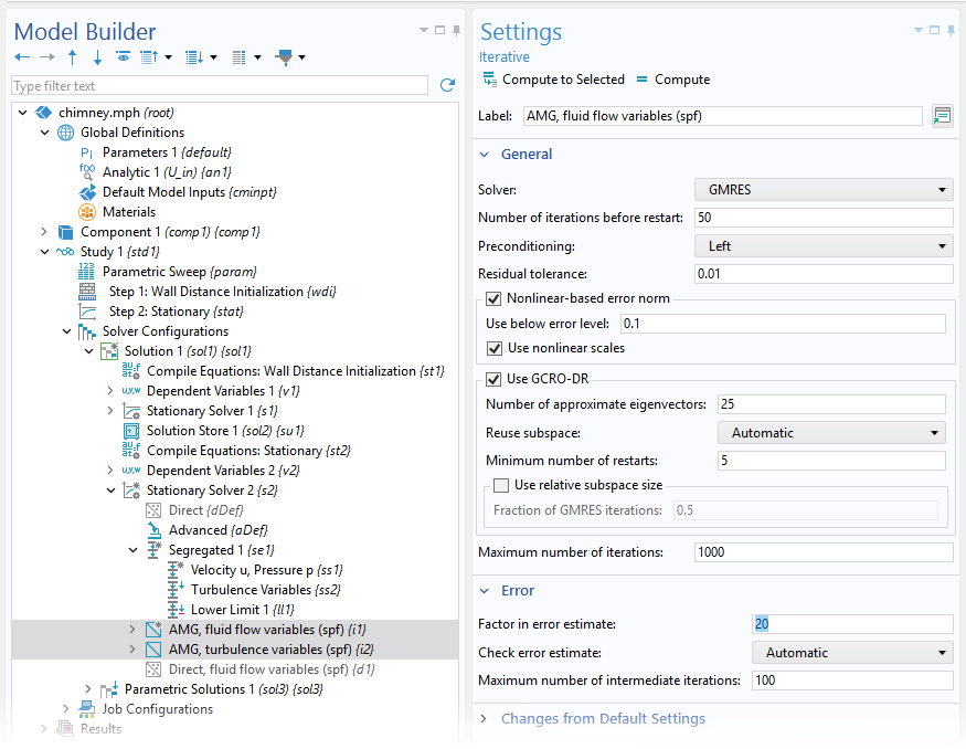 - In the Error section of the AMG, turbulence variables node (and the AMG, elliptic blending function node when applicable), unless the Turbulence model is set to Spalart-Allmaras decrease the Factor in error estimate to 20.